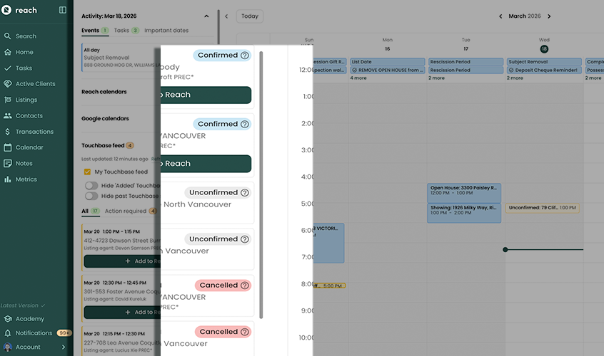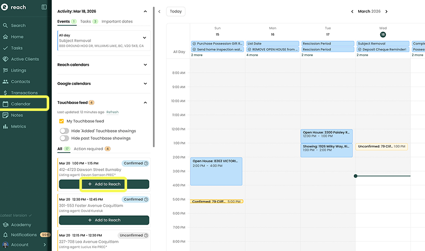 If you have integrated your Touchbase calendar feed, showing appointments from Touchbase will appear directly on your Reach calendar. Confirmed events that haven't yet been added to Reach will feature a pulsing border animation to draw your attention.