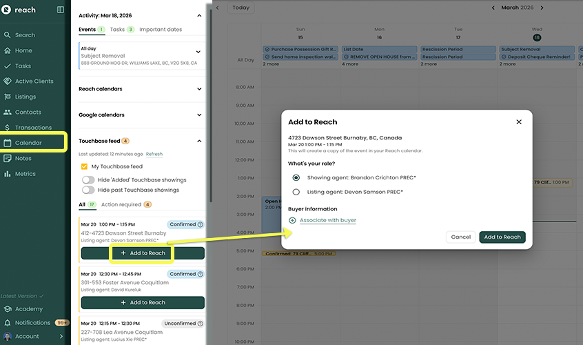 You must first confirm the event is Confirmed in Touchbase first. Touchbase -> Reach is a feed not a full integration. Unfortunately, Touchbase events cannot be confirmed in Reach (or modified); this must be done within Touchbase. Only once confirmed, can you add the event to Reach (and connect to a Client or Listing).