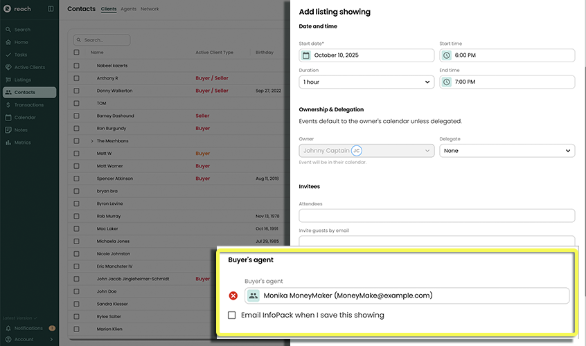 Listing Agents linked to a Showing Event will allow the system to send out an InfoPack (optional) or you will be able to send them an email directly from Reach at any time. Linking Agents to your showings also tracks the event to that Agent. It’s next level organization!