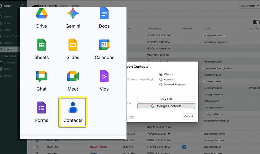 Reach lets you import Contacts — including Clients, Agents, and Network Partners — from the following sources: