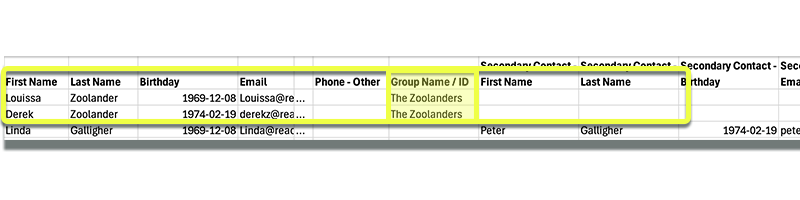 - Input the name of the group in the CSV. file heading/row called "Group Name/ID". ** You must make sure that the Group Name/ID is exactly the same for both Contacts. This will ensure that Contact #1 and Contact #2 are brought into Reach as a "Group Name/ID" (ie: The Zoolanders)