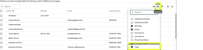 If the Tags column is not visible, click the (column selector) above and to the right of the table to select it.