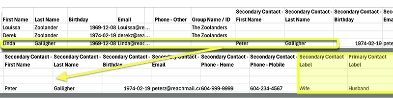Group a Group with 2 contacts on the same row (using "Secondary Contact" data) in the csv. file towards the last few columns of the sample CSV file above.