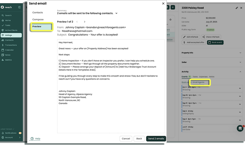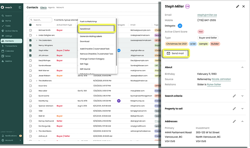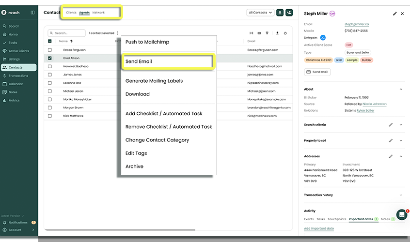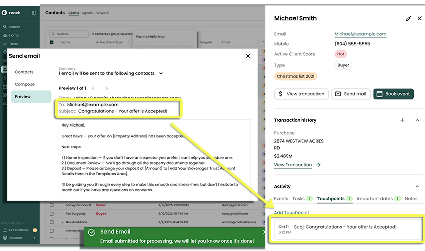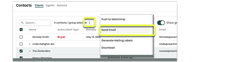 With Reach, you can send emails one-to-one or to a group of contacts— whether it's clients or agents. Compose a message on the spot, or save time by using a template you’ve already set up.