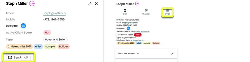 You can quickly select "Send Email" button from any Contact, directly when the contact has been selected. The Contact must have an email address in their details, in order to have this option available.