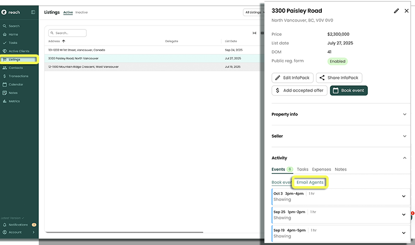 In the Activity of a Listing you have the option to mass email all the Agents that have had booked events associated with them. This will prompt a mass email to all agents linked. (Refer to Booking Events, for help on booking events and linking agents)