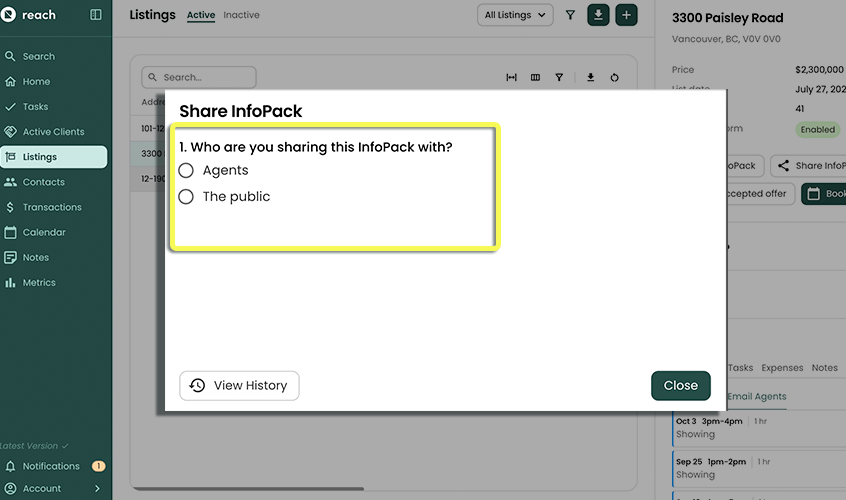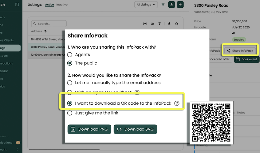 Utilize QR Code/Open House Sheets: These allow you to advertise and promote your Infopack to the public, view display marketing material auto-generated in Reach, that allows customers to SCAN --> RECEIVE (and capture their detail) to keep track of who receives your Public InfoPacks.