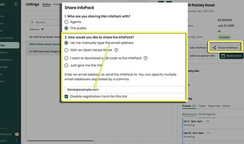 Reach users have a few different options to send out InfoPacks™: specifying emails, selecting from a list of Agents, or copying the direct link.