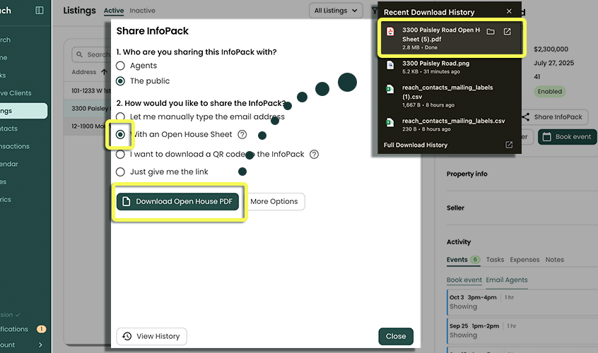 The Open House Sheet can either be downloaded and printed, or you can display the Open House sheet on a device at your Open House.