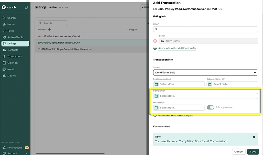 Note - Any dates that are inputted here (Rescission, Subject Removal, Completion and Possession) they will automatically create events in your calendar that are linked to this Transaction. It’s that simple!