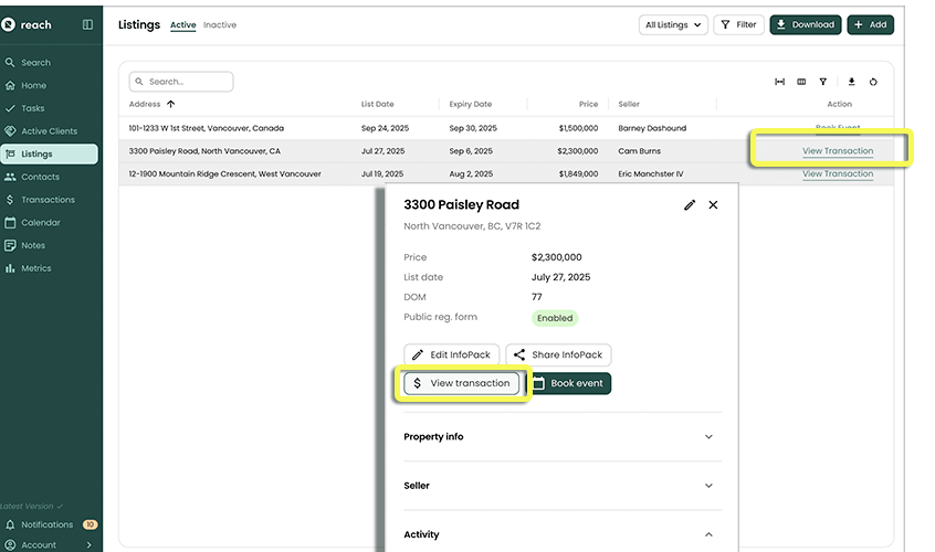 The Add Transaction form will appear pre-populated with the Listing's address and the Seller