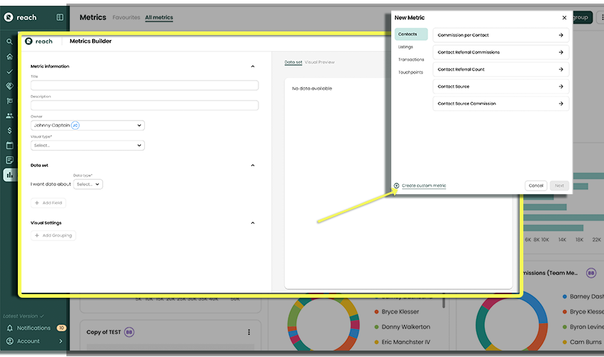 “Custom Metrics” is highly advanced; our in-app Customer Support Team is unable to support in the configuration of Custom Metrics. For help with the configuration of Custom Metrics, contact support@reachforagents.com and we will schedule a one-on-one call to assist. Please note there will be an additional charge on top your regular Reach subscription as Metrics can become very advanced and customized to specific teams/individual requests.