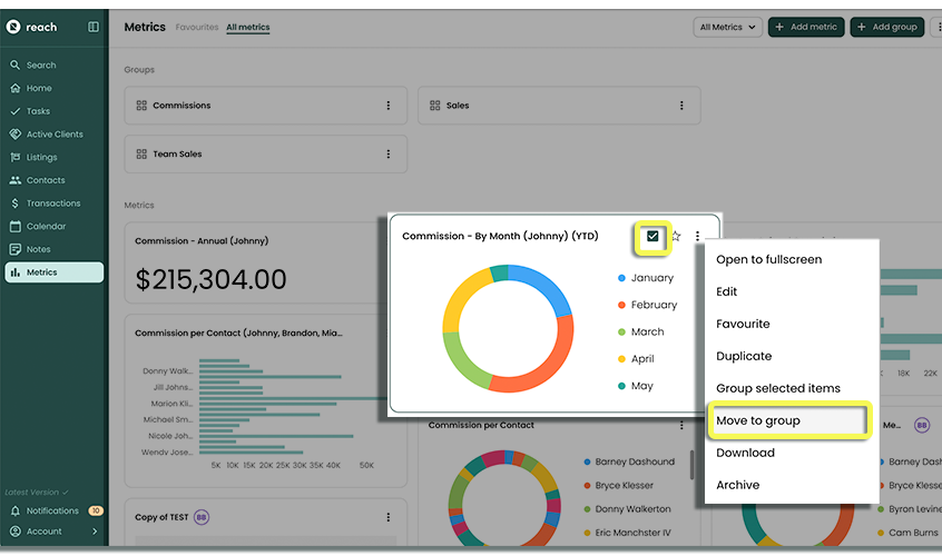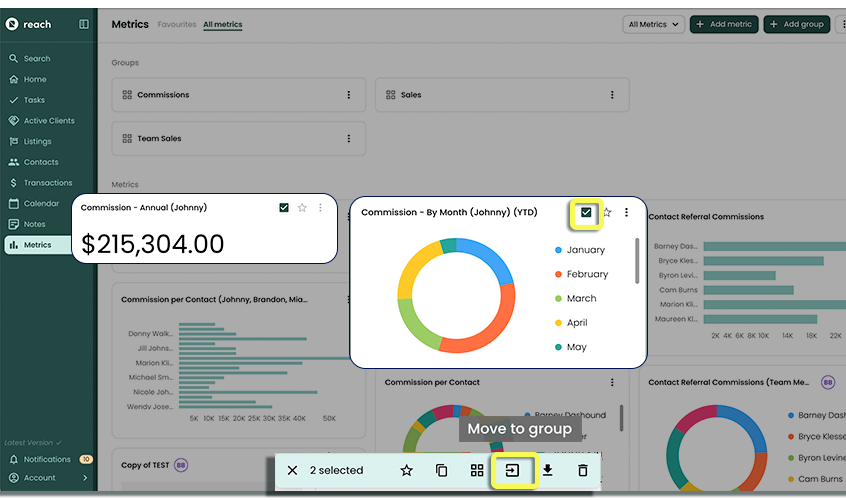 Grouping Metrics allows you to re-order your Metrics into groups that can be convenient for you to categorize and keep track of things like Sales or Listings type charts.