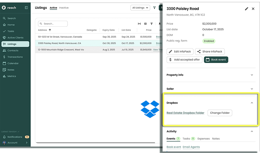 Reach integrates with Dropbox to give easy and quick access to your Listings' documents. Each Listing in Reach can be assigned a Dropbox folder; any documents in that Dropbox folder are listed when viewing a Listing. Simply click on a document to view it or click on the Dropbox folder link to open the folder in Dropbox.