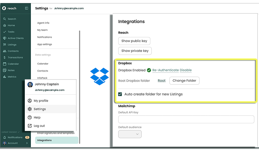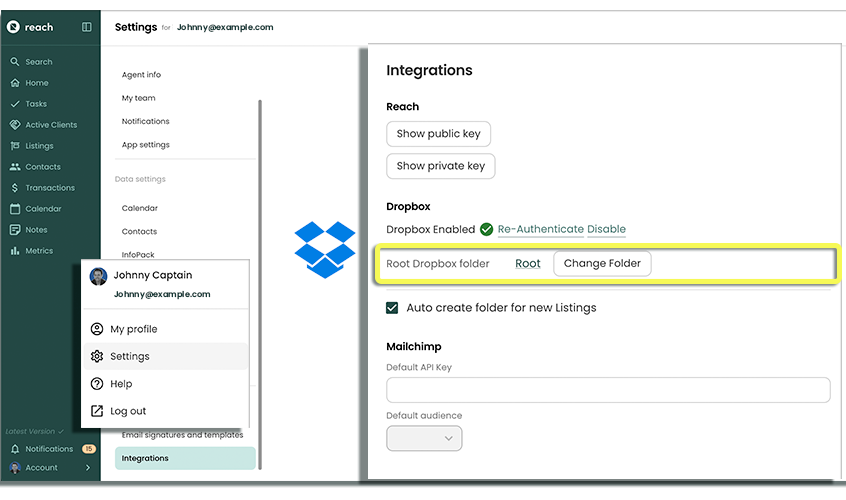 Reach can optionally create a new Dropbox folder for each new Listing. A folder with the address of the Listing will be created in the designated root folder. You can change the root folder in your Reach settings.