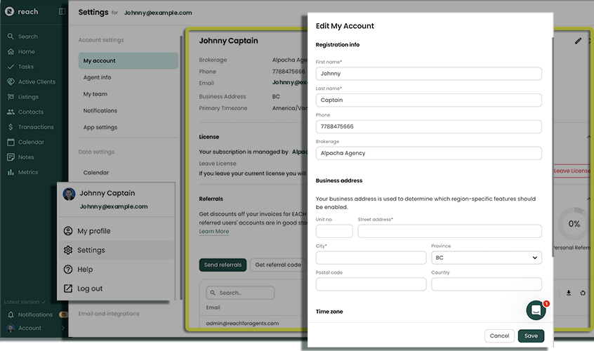To change the name of your Reach user or to change your mailing address, follow these steps: