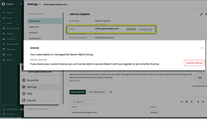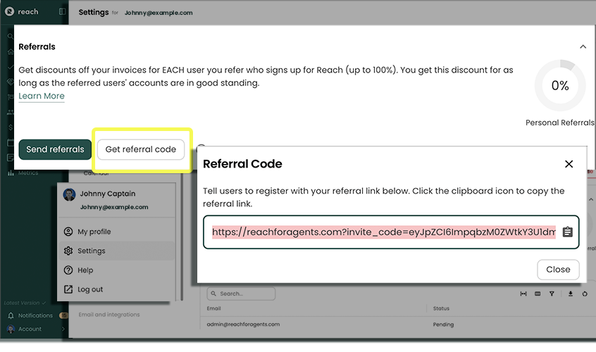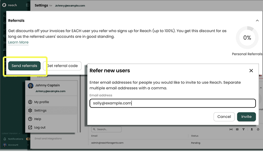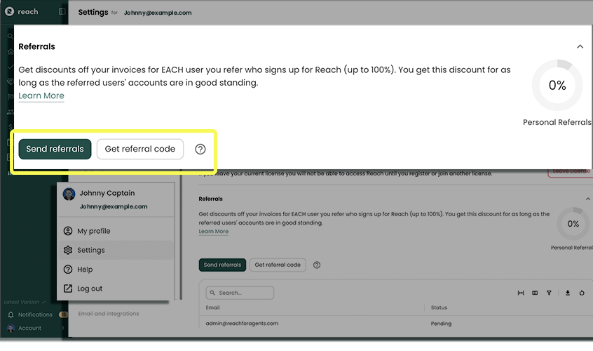 The Referrals section can be used to see your current referrals and send out new ones. Your current referrals are separated into Pending and Accepted. Only Accepted users count towards your discount.
