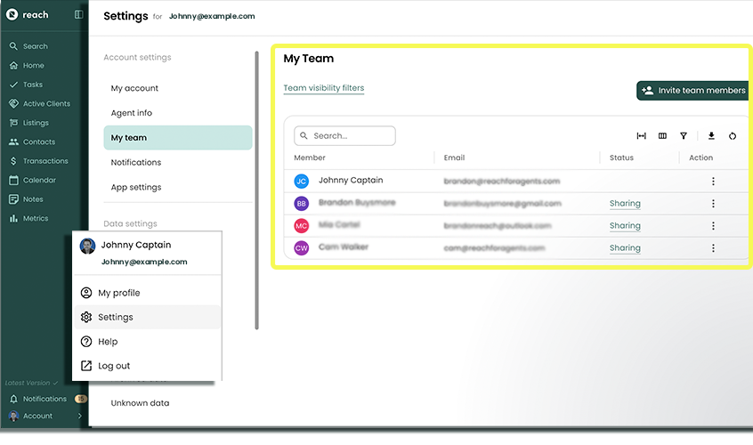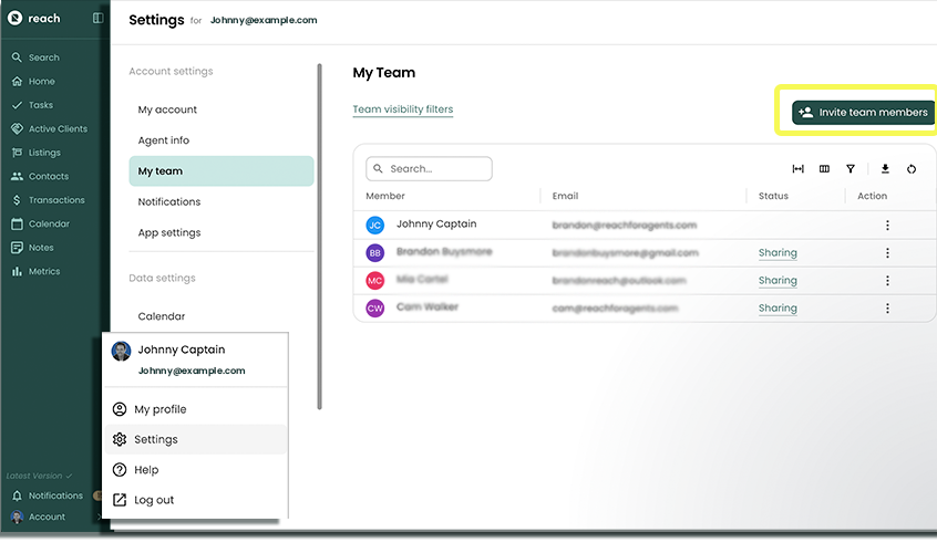1. The user logs in to Reach (or can click the "View Invite" in the email they received, Click their Account >> Settings >> My Team