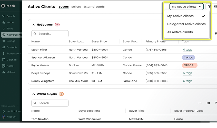 Sharing within Reach is granular and configurable. Granting a team member access to specific items does not automatically provide them access to other items. For example, a team member may be granted read-only access to Listings for reference purposes without permission to modify them.