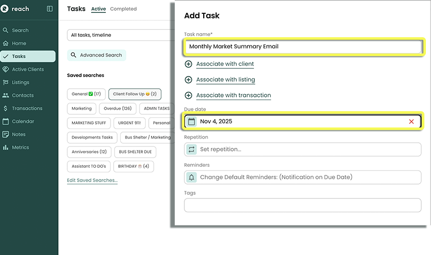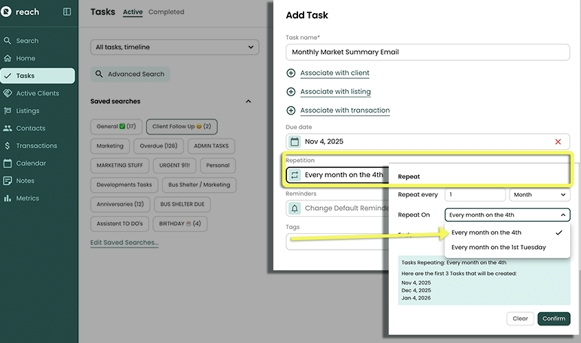 To fix this, Tom sets up a Repeating Task due on the 4th of every month (right after the new statistics are released), titled “MONTHLY MARKET SUMMARY EMAIL.” This way, Tom gets an automatic reminder every month to send his clients this important update — no more relying on memory, no more missed chances to stay top of mind.