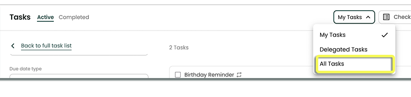 In the dropdown below the Task header, selects All Tasks