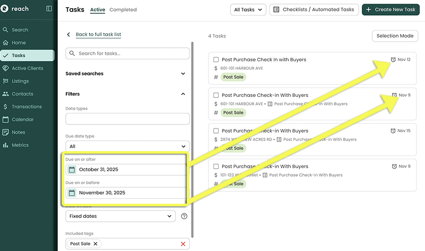 Tom now wants to filter all his upcoming Tasks related to past Transactions he has done. He is planning his client follow ups from sales (leading to more referral connections, he is sure of it!).