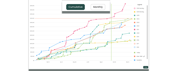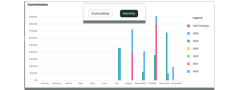 The Cumulative chart shows you the cumulative total of your commissions in a given calendar year. Hover over data points in the chart to bring up the respective Transaction's information.