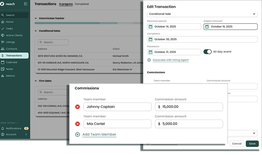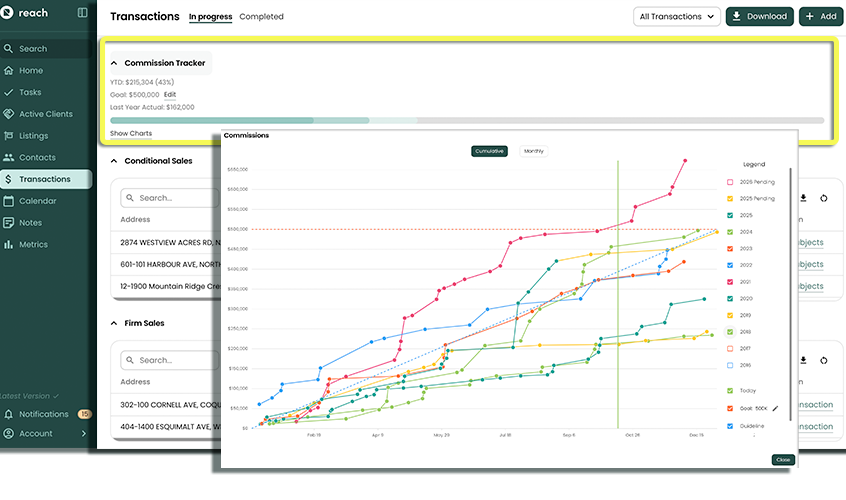 Reach lets you track your Transaction commissions and lets you know how you are doing throughout the year, as defined by your Commission Goal! (and other Metrics, see Metrics to learn more) Even if you are working with a team, you can set the individual commission amount, for each team member, on any given Transaction or even delegate that responsibility to your assistant. There's lots of flexibility.